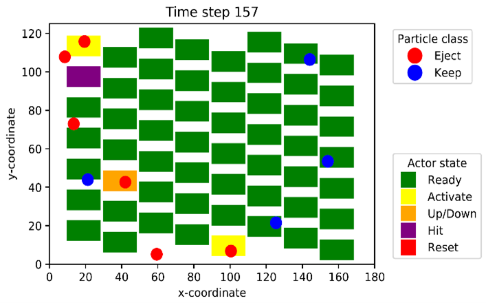 Im kooperativen Multi-Agenten Reinforcement Learning (MARL) versucht eine Vielzahl sogenannter Agenten – beispielsweise Roboter – durch Interaktion mit ihrer Umgebung gemeinsam ein Ziel zu erreichen, das für einen einzelnen Agenten in der Regel nicht erreichbar wäre. Im Rahmen dieses Praktikums soll die Steuerung eines sogenannten Multi-Aktoren-Array Sortierers mittels MARL erlernt werden. Dieser Sortierer besteht aus mehreren Reihen mechanischer Aktoren, wobei jeder Aktor als eigenständiger Agent betrachtet werden kann. Dadurch ergeben sich zahlreiche Möglichkeiten zur Trennung von Partikeln. Ziel ist es, eine Konfiguration zu identifizieren, die hinsichtlich der Sortiergenauigkeit – gemessen an der Anzahl korrekt ausgeschleuster und korrekt nicht-ausgeschleuster Partikel – optimal ist.