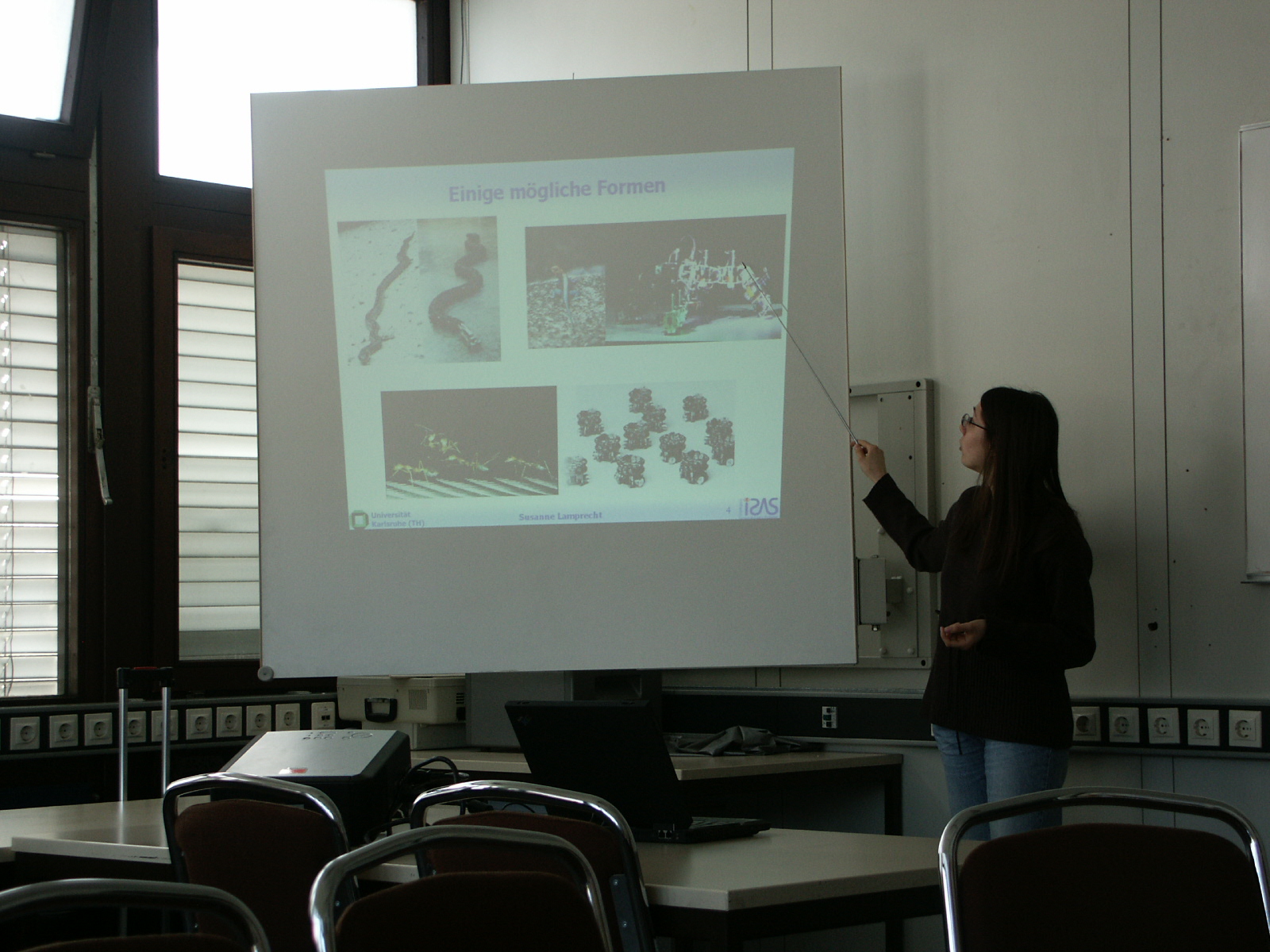 Beim Vortrag über Modulare Rekonfigurierbare Roboter der Studentin Susanne Lamprecht, schossen wir auch noch ein paar Bilder. In dem Vortrag ging es um Roboter, die man in der Weltraumforschung, in der Tiefsee und in Gebieten nach Naturkatastrophen einsetzen kann, die sich auch jederzeit selbst reparieren können indem sie die defekten Module abwerfen.