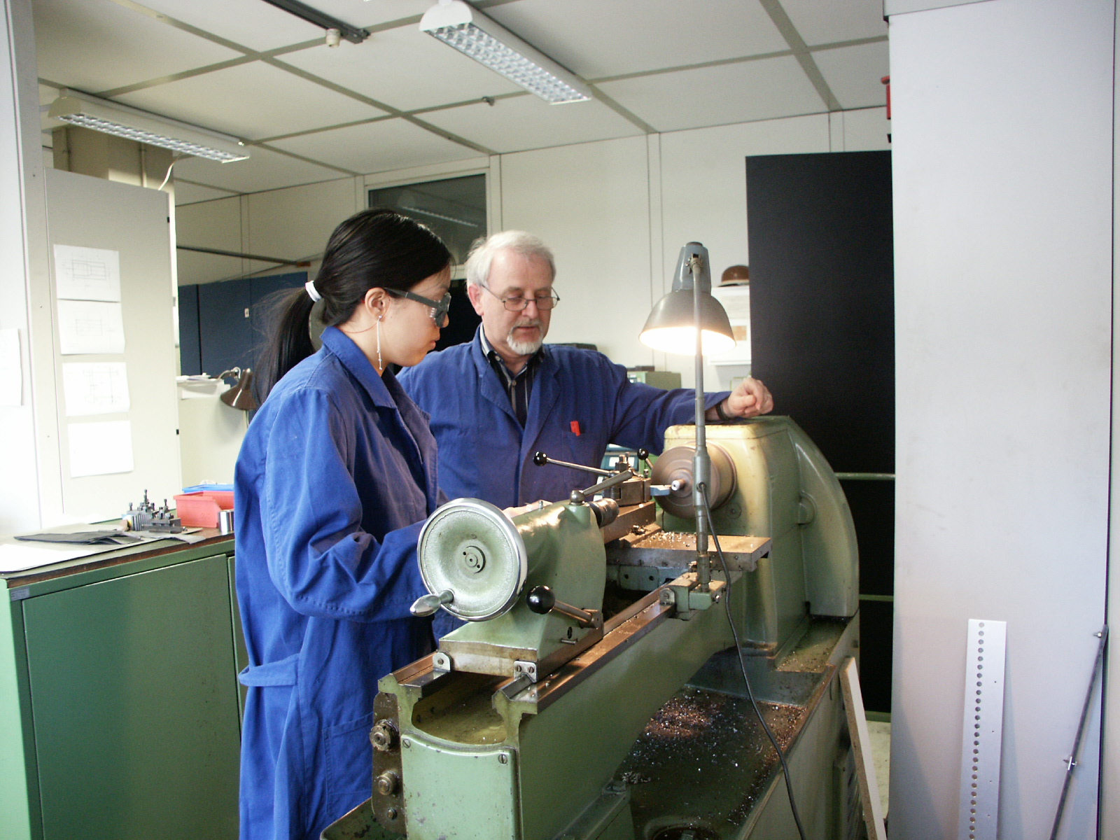 Danach zeigte uns der Diplom-Ingenieur Herr Brunn ein Modell einer Drehmaschine, das man auch Achsenprüfstand nennt. Dieses Gerät dient dazu, den Bohrer einer Drehmaschine möglichst senkrecht zu dem Material, das man bearbeiten möchte, zu plazieren.